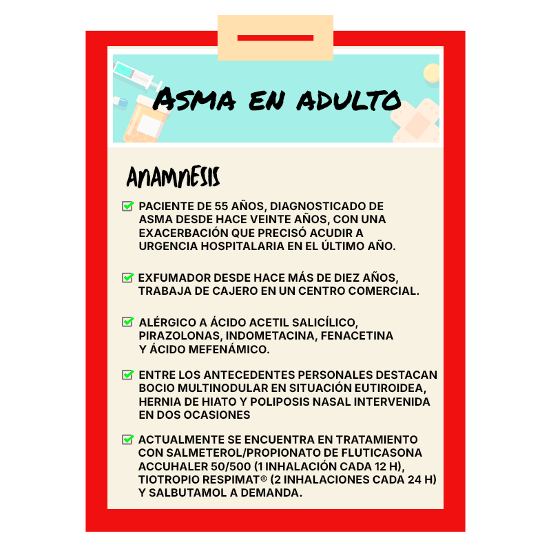 Paciente de 55 años, diagnosticado de asma desde hace veinte años, con una exacerbación que precisó acudir a urgencia hospitalaria en el último año. Exfumador desde hace más de diez años. Acude a consulta por disnea al caminar de forma rápida o subir cuestas, que suele empeorar por la noche, y que se suele acompañar de tos y opresión torácica. Actualmente se encuentra en tratamiento con salmeterol/propionato de fluticasona Accuhaler 50/500 (1 inhalación cada 12 h), tiotropio Respimat® (2 inhalaciones cada 24 h) y salbutamol a demanda. La sintomatología mejora con salbutamol, teniendo que administrarse el inhalador hasta cuatro veces al día, durante las últimas dos semanas. Se realiza un test ACT al paciente, que arroja una puntuación de 15.